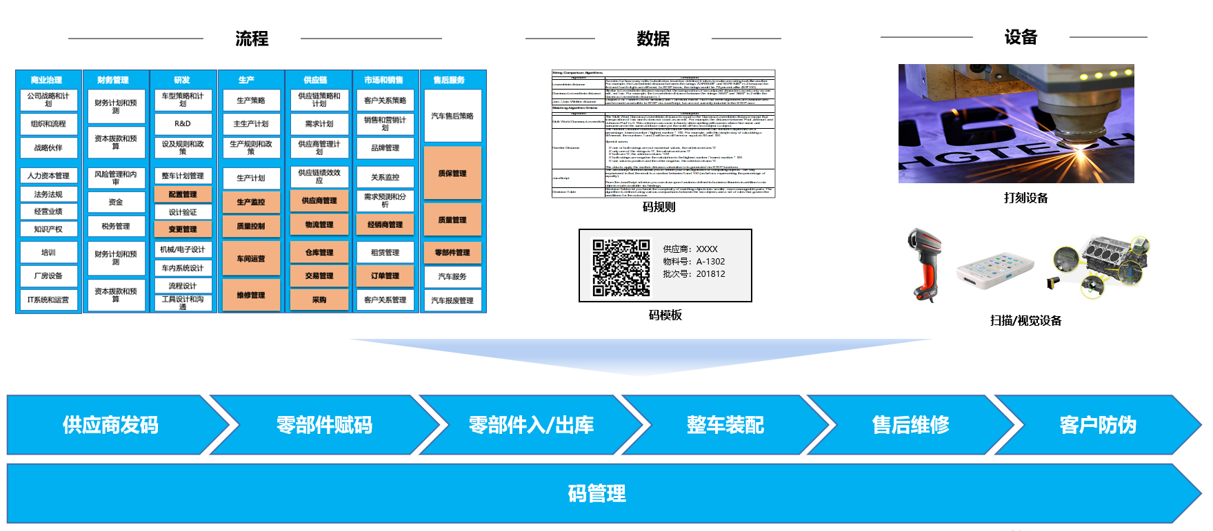 方案总览通过汽车行业CBM经典模型分析,建立以码为中心的,覆盖零部件全生命周期的端到端管理流程,构建集成供应链和售后服务的码管理平台。