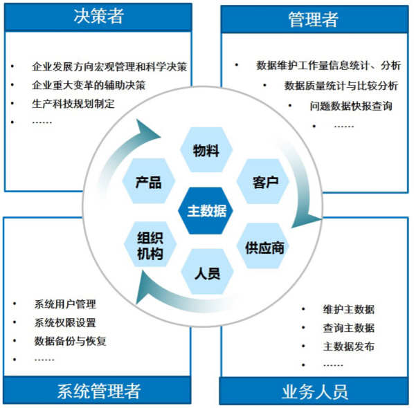 系统依据主数据管理理论及特点,涵盖主数据存储、整合、清洗、发布和管控。主数据管理系统将帮助企业建立起集中的主数据管理环境,消除信息孤岛,统一、规范数据编码,加强数据审计,使得企业信息化建设基础更加稳固、可用,为开展各项业务系统联动和数据分析、数据挖掘等做好充分准备。正确的主数据带来的是正确的决策、准确的财务数据、完整的库存状况、清晰的销售报表等优势;反之,带来的是决策的错误、产值的不断下滑、报表之间混乱等问题。